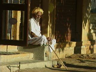 An old-timer of Jaisalmer taking up his morning routine watching over the activites at Gandhi Chowk street - the center of town.